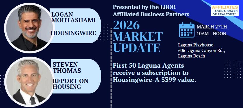 27 Mar 2026 Market Update 2026 Market Update Friday, March 27, 2026 (10:00 AM to 12:00 PM) Laguna Playhouse, Laguna Beach, California Details You're Registered! DescriptionLocationCancellation Policy Laguna Playhouse Laguna Playhouse606 Laguna Canyon Rd.Laguna Beach, CA 92651 Map & Directions