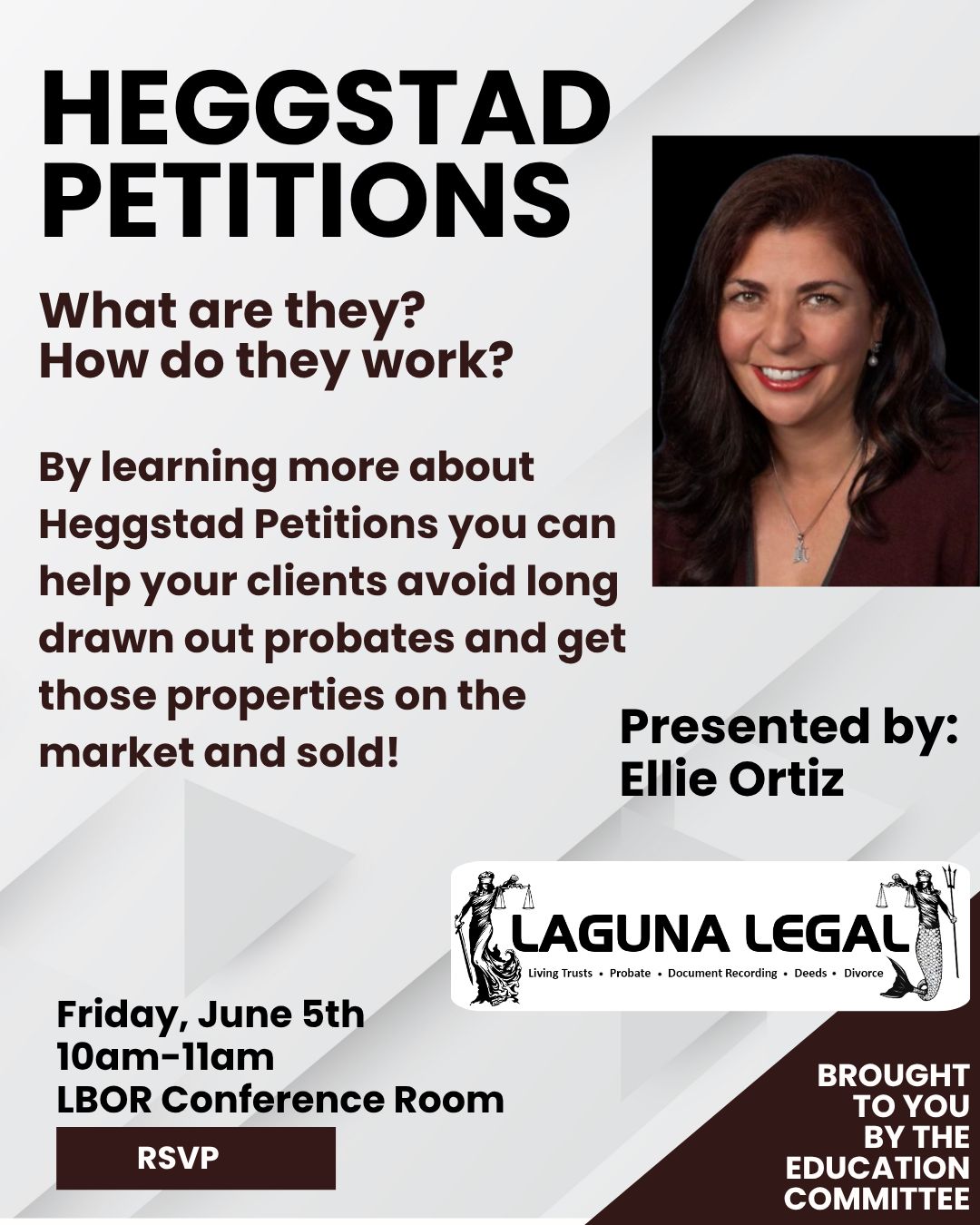 05 Jun Heggstad Petitions Heggstad Petitions Friday, June 5, 2026 (10:00 AM to 11:00 AM) LBOR Conference Room, Laguna Beach, California Details You're Registered! DescriptionLocation LBOR Conference Room LBOR Conference Room939 Glenneyre St #CLaguna Beach, CA 92651 Map & Directions