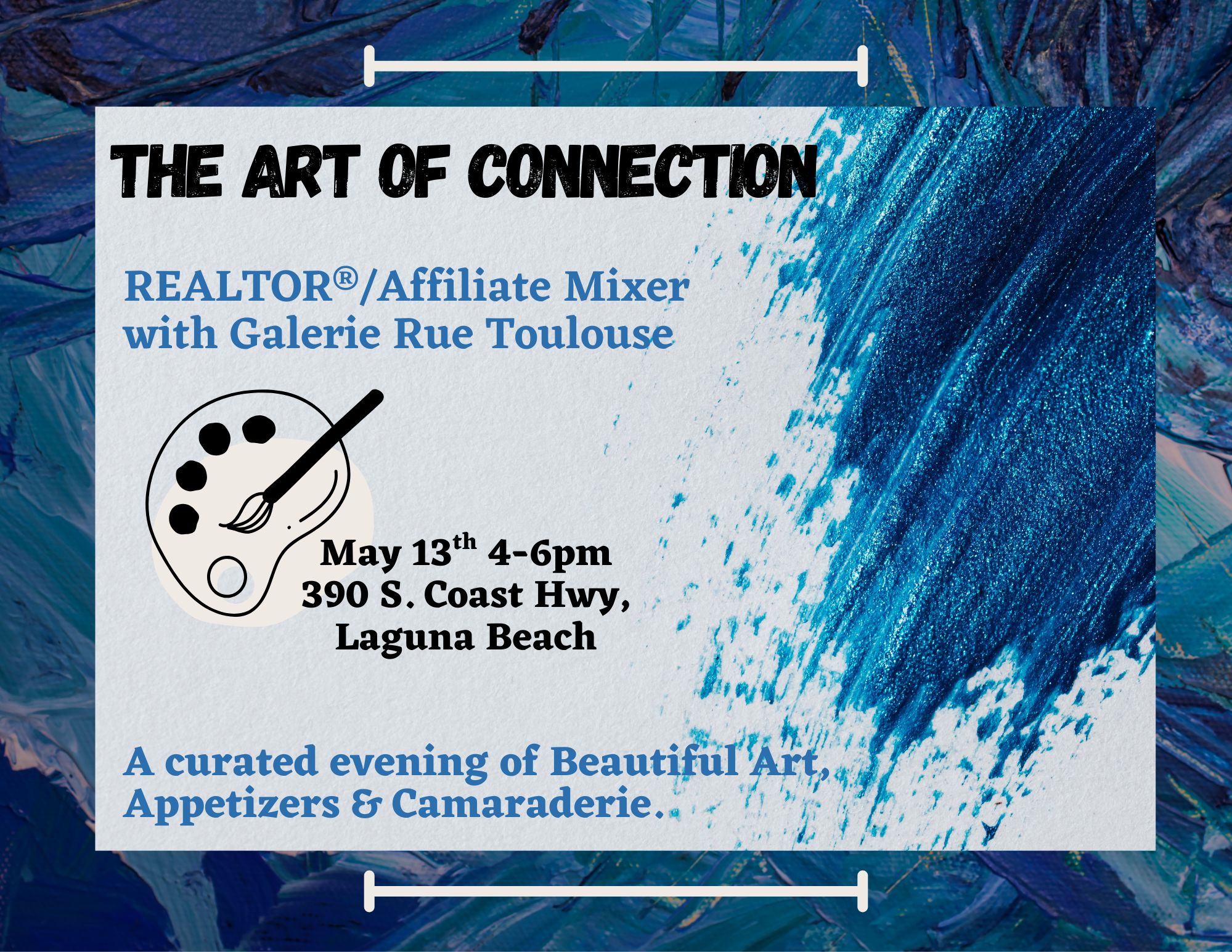 13 May REALTOR/Affiliate Mixer - The Art Connection REALTOR/Affiliate Mixer - The Art Connection Wednesday, May 13, 2026 (4:00 PM to 6:00 PM) 390 S. Coast Hwy. Details You're Registered! DescriptionLocation 390 S. Coast Hwy. Laguna Beach, CA 92651